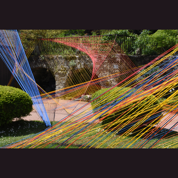 Le jardin Bas met en avant l’espace ouvert avec des nappes de cordelettes colorées, tendues, vrillées ou attachées en cercle. Ces grandes plages de fils colorés accueillent le visiteur comme une incitation à les traverser et découvrir les secrets du jardin fleuri.