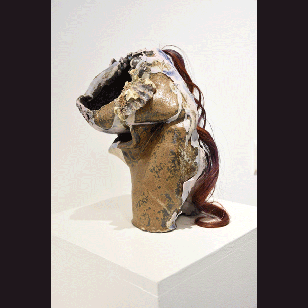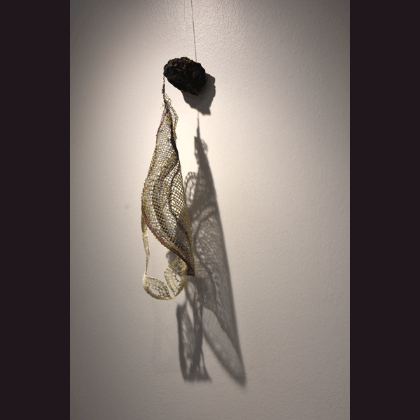 S’échappant de la rusticité de la pierre-céramique, le fil souple se noue en quelques dentelles au fuseaux.