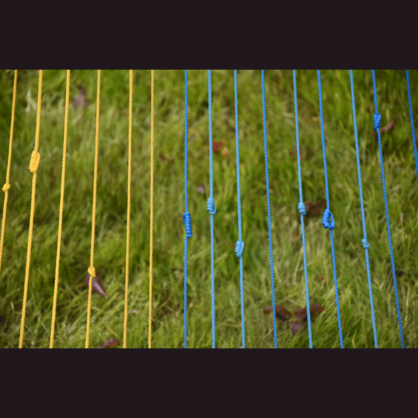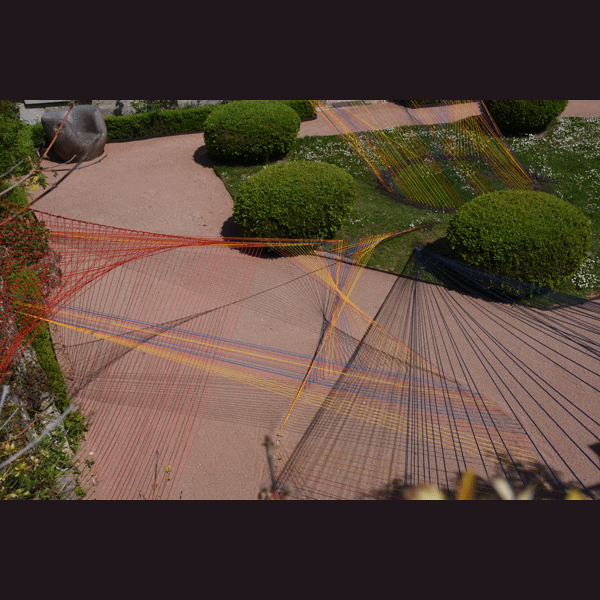 Le jardin Bas met en avant l’espace ouvert avec des nappes de cordelettes colorées, tendues, vrillées ou attachées en cercle. Ces grandes plages de fils colorés accueillent le visiteur comme une incitation à les traverser et découvrir les secrets du jardin fleuri.