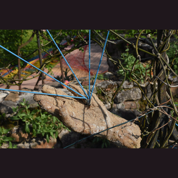Dans le jardin du haut du musée de l’outil, des moulages de mains, grainées de terre et de sable, tordues et bosselées, évoquent les mains usées mais délicates du jardinier s’insinuant partout, œuvrant chaque jour à façonner et entretenir ses plantes.